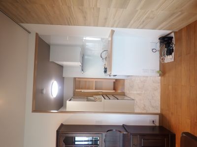 施工後 リビングキッチン ダウンライトと正面の見せる壁が生える