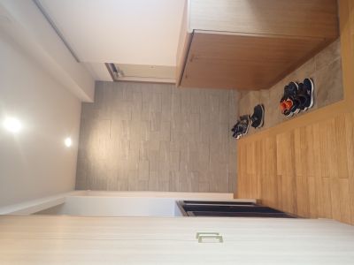 玄関はお客様を迎える玄関機能と外出するクローゼット機能。具体的には家族の衣類、道具、趣味などの雑多な置きスペース。